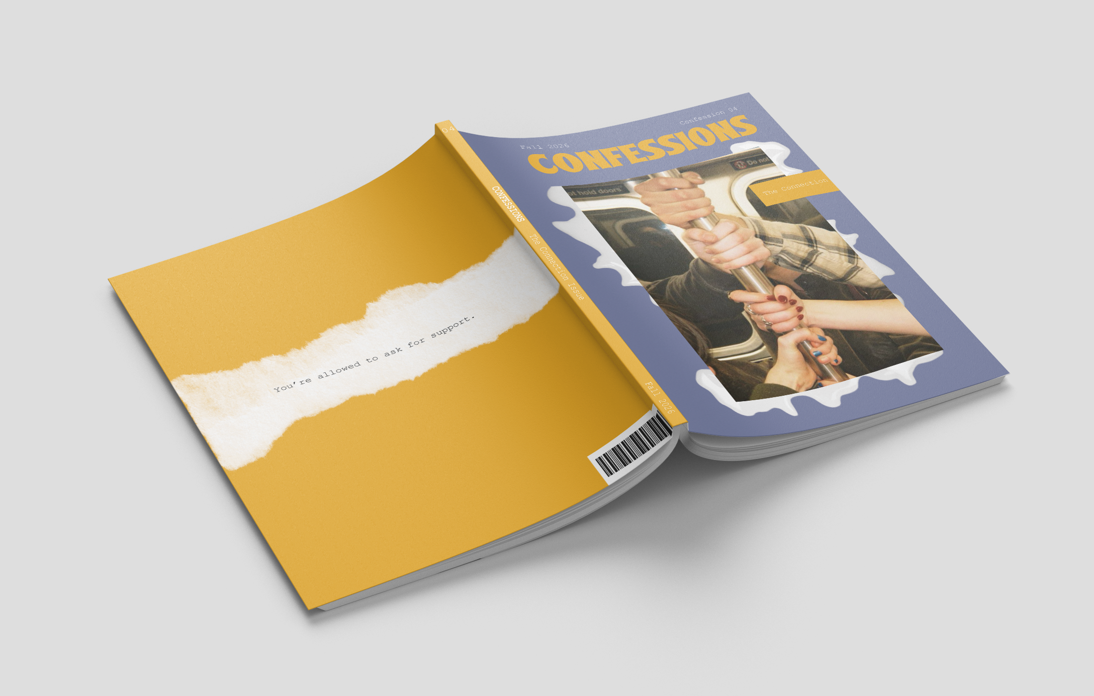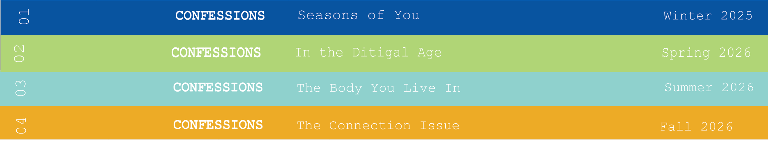 At the top of the cover, the masthead spells out Confessions, instantly setting the tone for a magazine rooted in honesty and journal-like reflection. The date appears quietly on the upper left, while the issue number anchors the upper right. We label each issue “Confession #” framing it as a written entry pulled straight from someone’s private notebook.