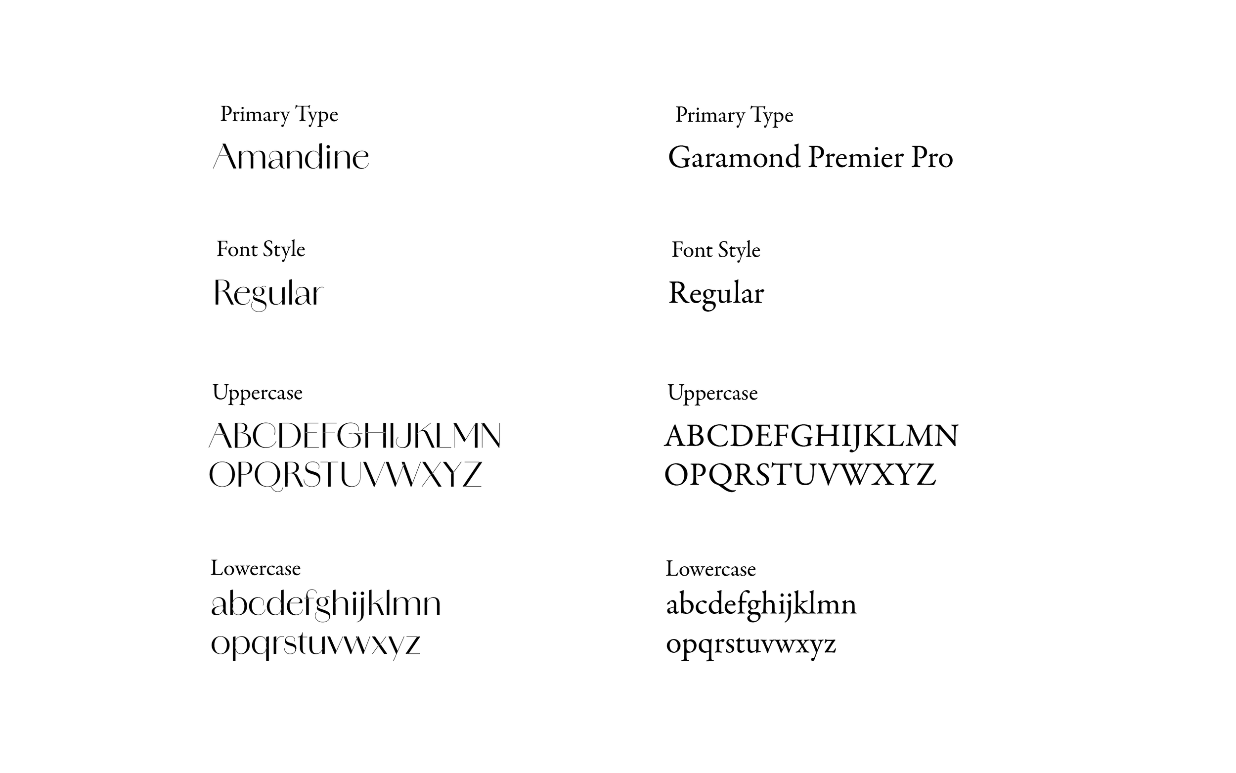 The typgraphy chosen for this rebrand is Amadine for the primary typeface, with Garamond as a complimenting secondary typeface. Both give a luxurious, fancy vibe that is the feeling targeted for this rebrand. Amadine mixes thin and thick strokes, and adds curling details for specific letters that give it a delicate yet striking and impactful look. Meanwhile Garamond is a classic, readable serif font that evokes the luxurious look we are aiming for.